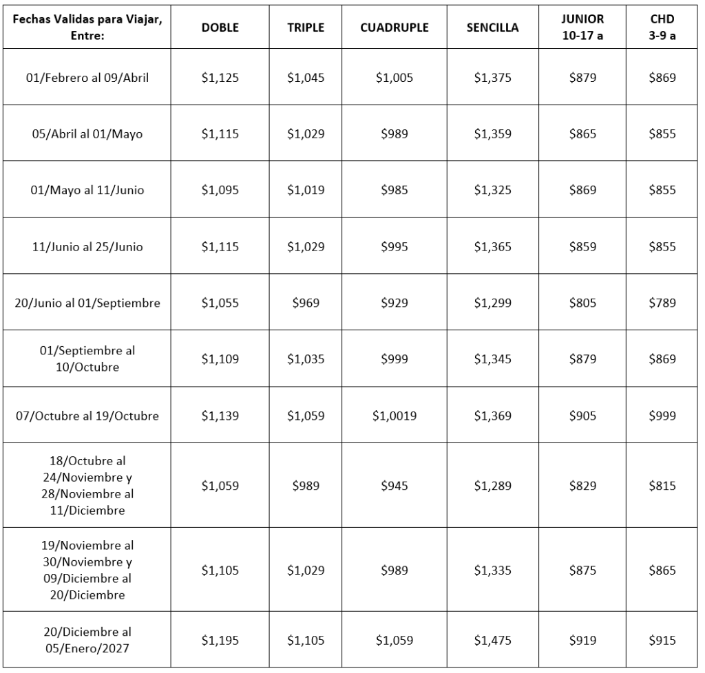 Aplica viajando en fechas: 01/Febrero a 19/Octubre