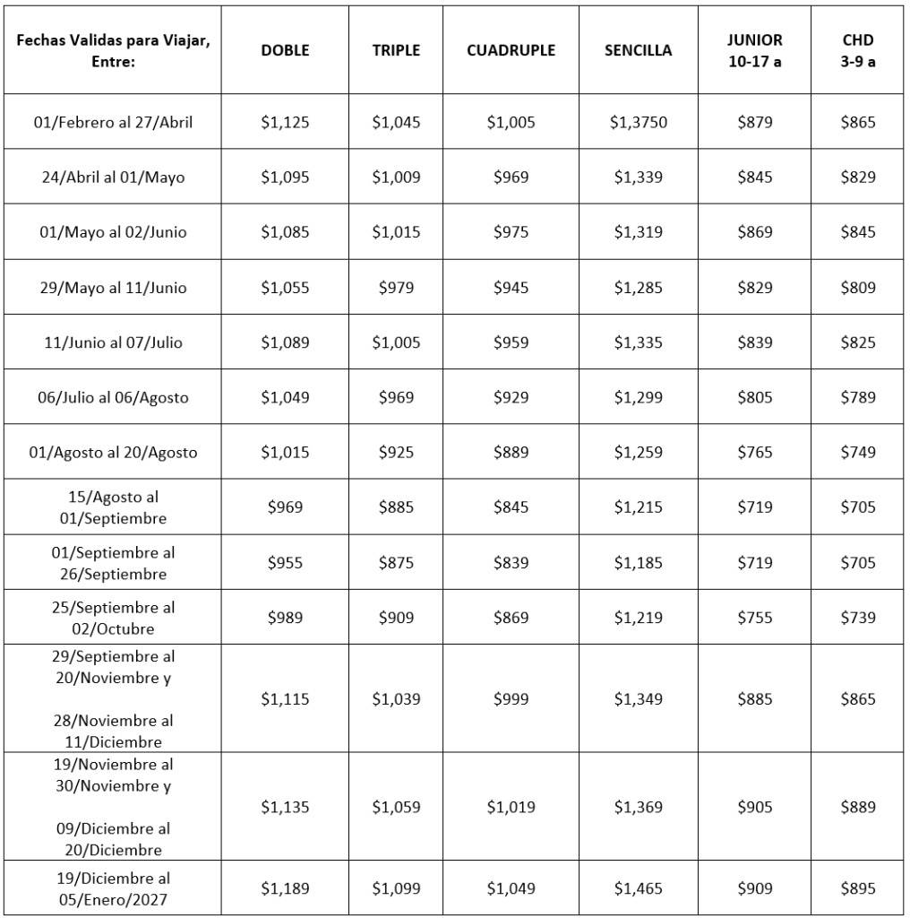 Aplica viajando en fechas: 01/Febrero a 28/Mayo