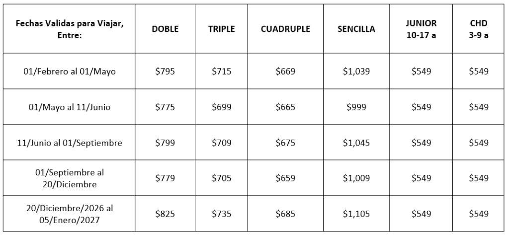 Junior/Menores: compartiendo misma habitación con 2 pasajeros pagados por doble o 3 pasajeros pagados por triple o 1 pasajero pagado por sencillo.