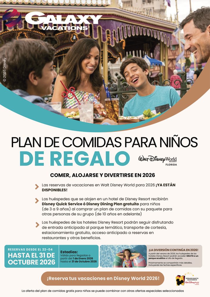 Beneficio: Los niños de 3 a 9 años reciben un plan de comidas gratuito (Disney Quick Service o Disney Dining Plan) al comprar un paquete que incluya plan de comidas para los adultos del grupo (personas de 10 años en adelante) y alojamiento en un hotel de Disney Resort.