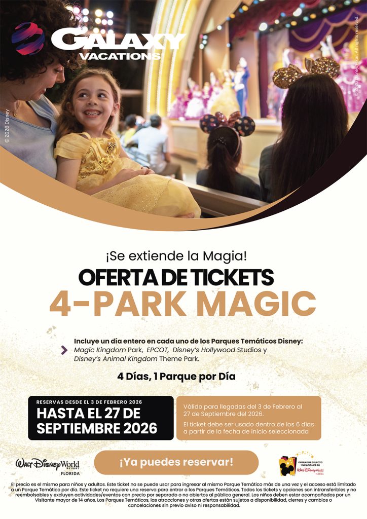 Un día entero en cada uno de los cuatro Parques Temáticos de Disney: Magic Kingdom Park, EPCOT, Disney’s Hollywood Studios y Disney’s Animal Kingdom Theme Park.